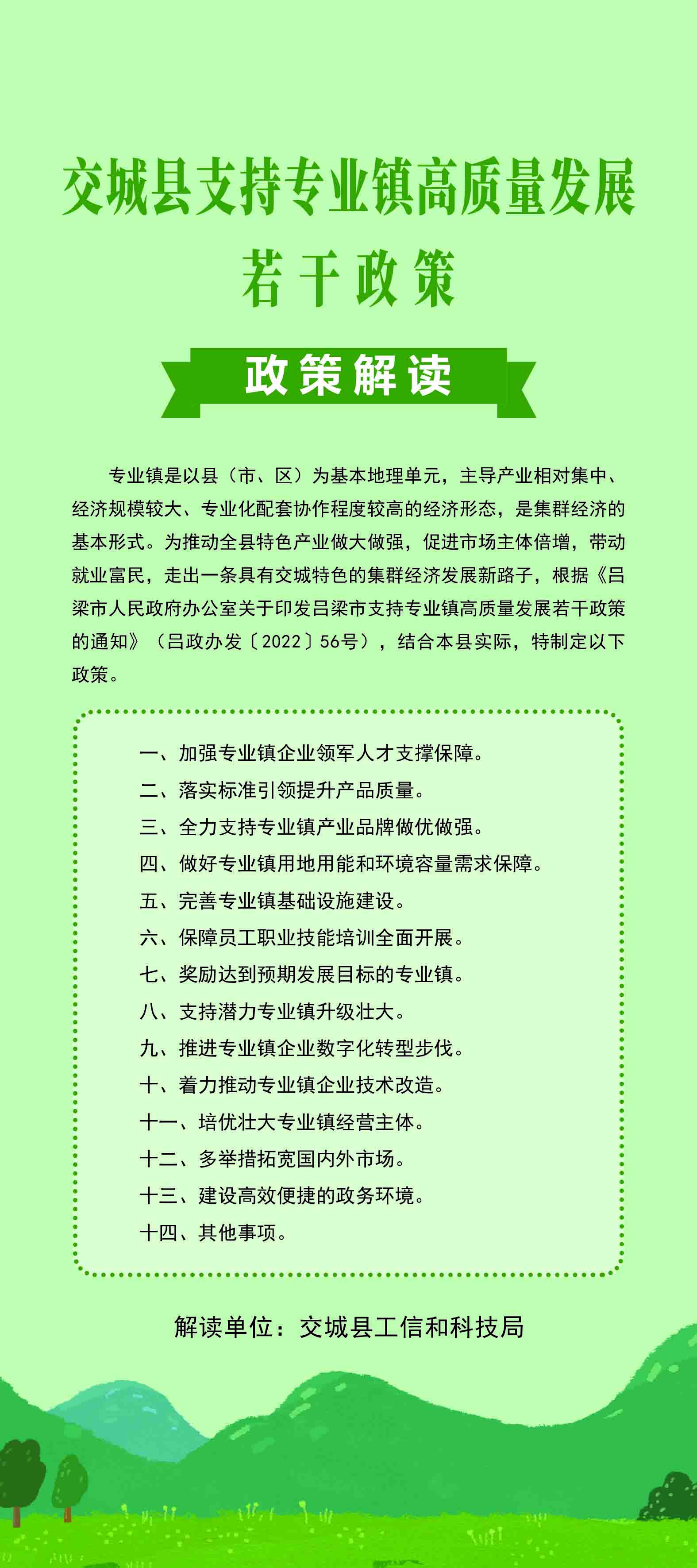 相關(guān)文件:關(guān)于印發(fā)交城縣支持專業(yè)鎮(zhèn)高質(zhì)量發(fā)展若干政策的通知