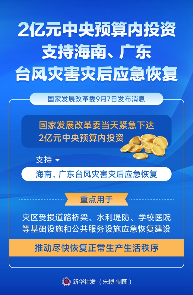 國家發(fā)展改革委9月7日發(fā)布消息,國家發(fā)展改革委當(dāng)天緊急下達(dá)2億元中央預(yù)算內(nèi)投資,支持海南、廣東臺風(fēng)災(zāi)害災(zāi)后應(yīng)急恢復(fù),重點用于災(zāi)區(qū)受損道路橋梁、水利堤防、學(xué)校醫(yī)院等基礎(chǔ)設(shè)施和公共服務(wù)設(shè)施應(yīng)急恢復(fù)建設(shè),推動盡快恢復(fù)正常生產(chǎn)生活秩序。