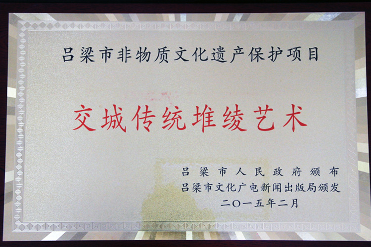 民間工藝美術(shù)品 “交城堆綾”,脫胎于唐代“堆錦”藝術(shù),已有一千余年歷史。明清時代流行于中上層社會做為家庭壁掛式陳設(shè)裝飾。改革開放后,經(jīng)過民間藝人解愛英家族親屬系統(tǒng)挖掘、傳承和創(chuàng)新,融入刺繡工藝,改進(jìn)材料,拓展題材,創(chuàng)新了座鏡透屏,使“交城堆綾”民間藝術(shù)得以青春煥發(fā)?!敖怀嵌丫c”以表現(xiàn)花卉靜物人物見長,色彩艷麗、惟妙惟肖,有“軟體浮雕”和“立體國畫”的美譽(yù)。堆綾全部是手工制作,先將畫好的圖案描在白版紙上,依圖線剪裁成若干紙塊,再在這些紙塊上貼飛邊、壓紙捻、絮棉花,再覆以各色綾絹綢緞布料,然后,經(jīng)過撥折、軟折、刺繡彩繪、貼金錫線等手工藝,使之成為片狀半成品,將其拼貼在背景底版上,外罩玻璃框架,成為一幅精美絕倫、栩栩如生的觀賞工藝美術(shù)品。